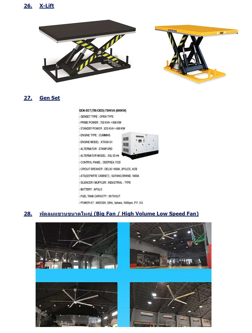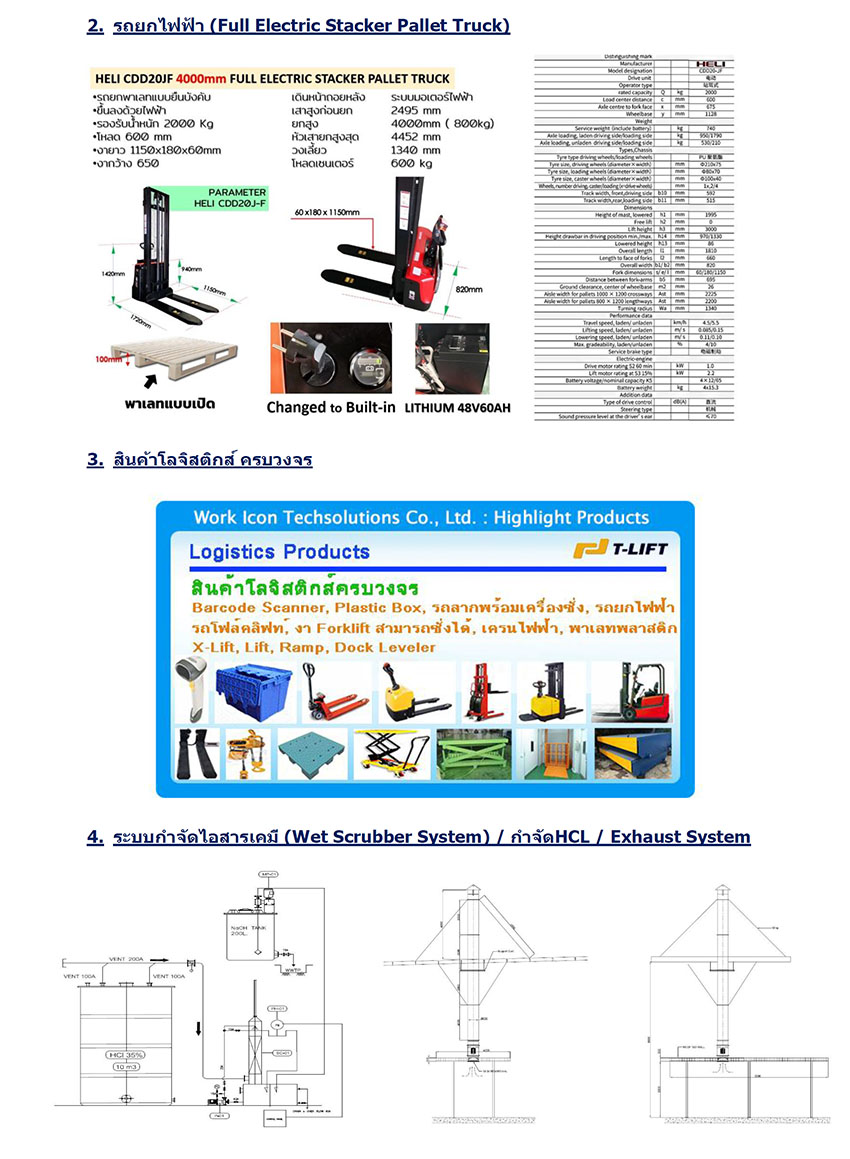 ระบบกำจัดไอสารเคมี (Wet Scrubber System)/กำจัดHCL/Exhaust System, รับซ่อมรอยรั่วหลังคา/เปลี่ยนหลังคาสำหรับอาคารใหญ่, RFID Automated Truck Scale/RFID Dock Loading System/RFID Gate System, Dry Scrubber, รับทำห้องเย็น, ระบบทำความเย็น (Cooling System), Mobile Yard Ramp, High Speed Doors, Dock Shelter, Selective Pallet Rack, พัดลมแขวนขนาดใหญ่, Furniture และ เก้าอี้ห้องLab, Fire Alarm System, Outdoor Aluminium Panel (โครงสร้างอลูมิเนียมนอกอาคาร), Aluminium Ceiling (เพดานอลูมิเนียม), Aluminium Sun Louver (แผงบังแดดอลูมิเนียม) เป็นต้น